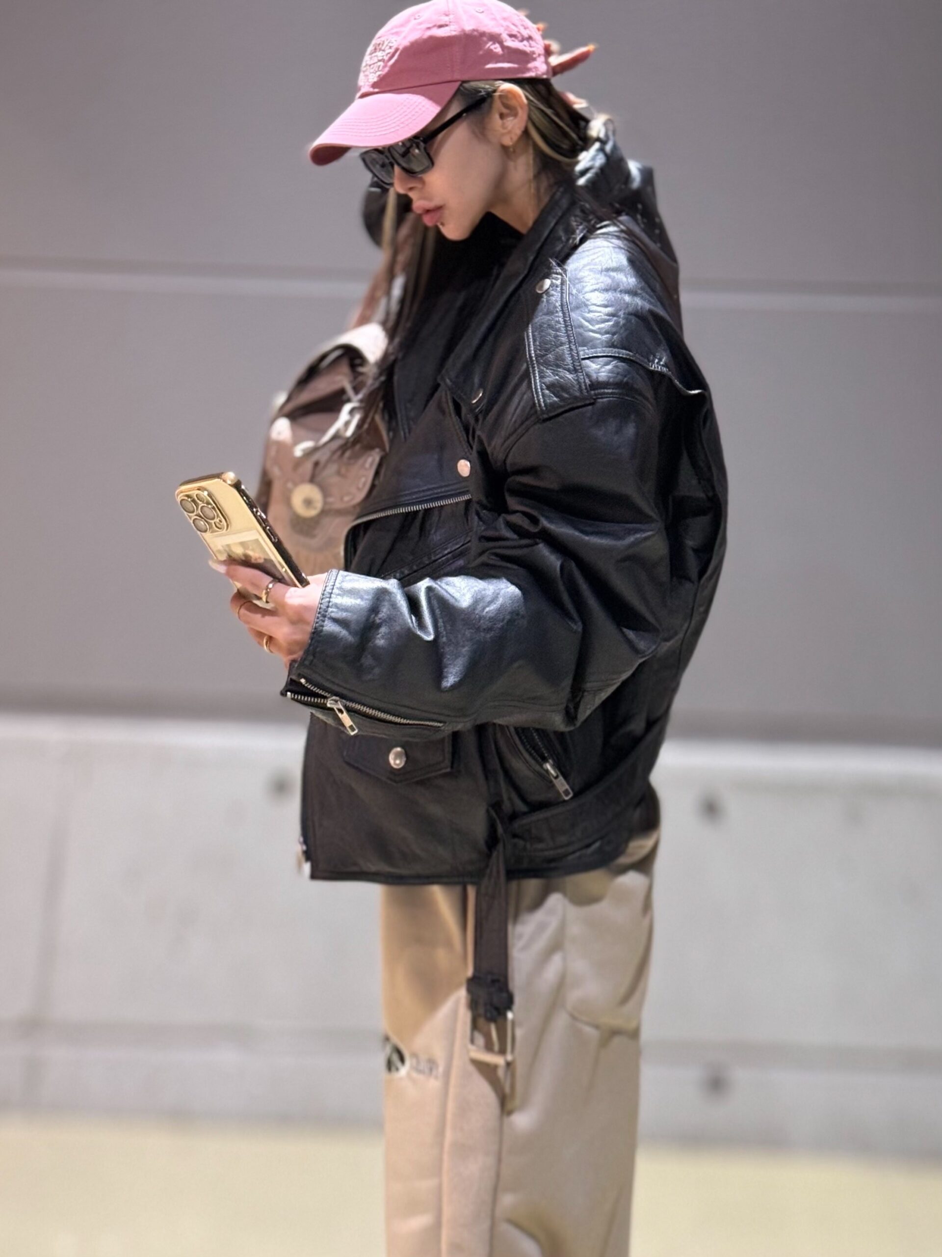 スウェットにライダースで