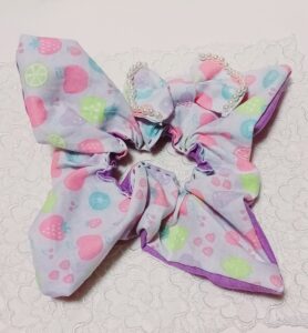 フルーツ柄のリボンがポイントで普段使いからお出かけ迄幅広く使えます。
