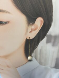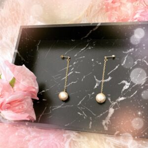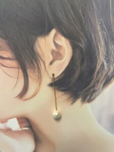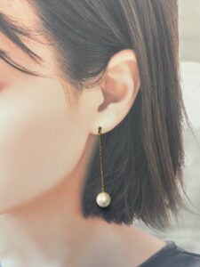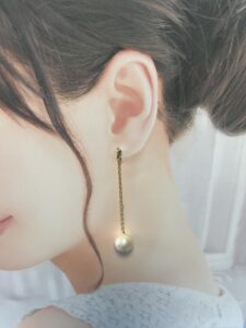 このシャンパンゴールドのピアスは、見本は長さは長めで、1.2ミリのコットンパールの大きさです❣️