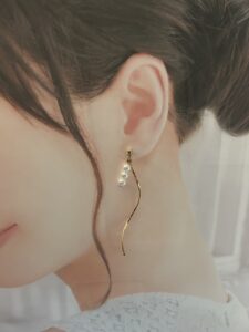 流線型デザインと白いパールが特徴のカジュアルな両耳用ピアス。