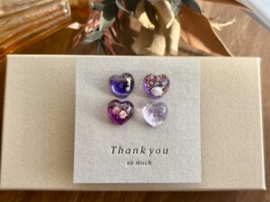 濃い紫、薄い紫、ピンク紫、透明の中に紫ラメの紫づくしです。